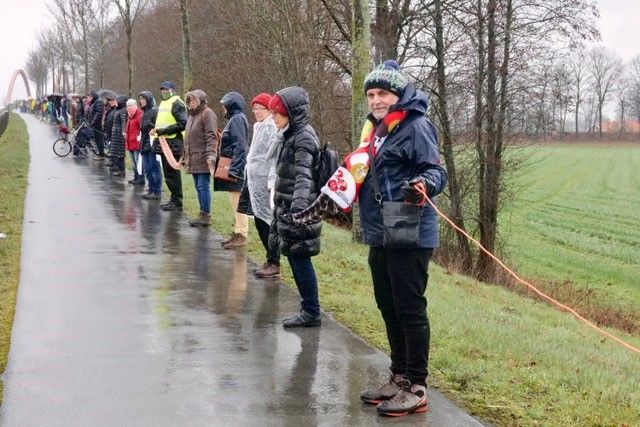 Ein wunderschönes Erlebnis stellte das Anknüpfen an den Streckenabschnitt 22 dar, als aus gähnender Leere auf der Schmedehausener Straße plötzlich orangerote Punkte am Horizont auftauchten: eine große Gruppe mit Warnwesten gekleideter Menschen rückte heran und wurde von uns mit Applaus und Handschlag willkommen geheißen! Auf unsere Frage: „Können wir noch helfen?“ kam die selbstbewusste Antwort: „Nein, wir wollen euch helfen!“ Gut ausgerüstet mit „Flatterband“ und Seilen war auch hier schnell die Friedenskette verbunden!